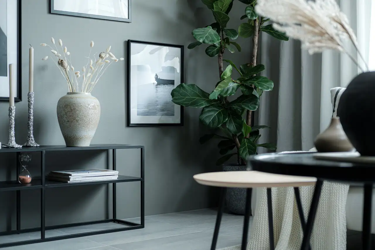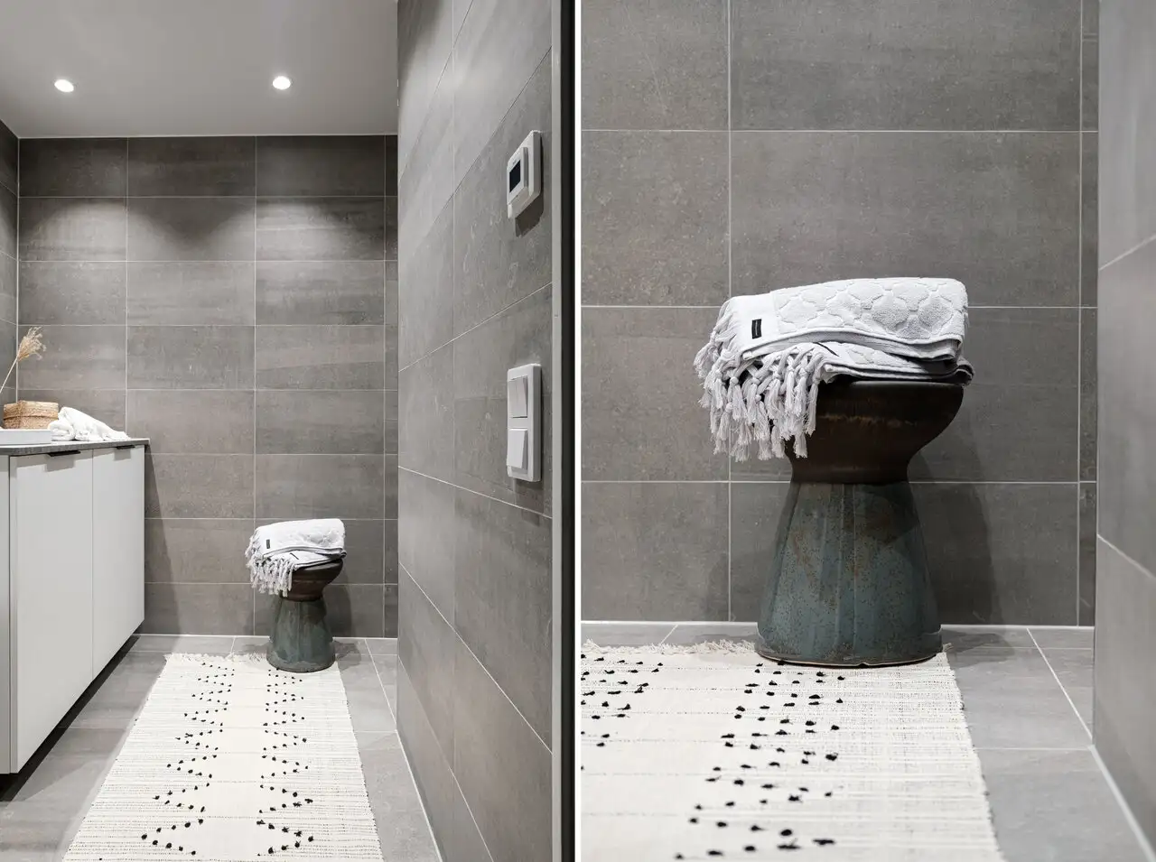 Från hemmets hall nås samtliga rum och väggar är målade i grått. Här finns plats för avhängning samt en stor klädkammare som erbjuder god förvaring. Alla väggarna i lägenheten är målade hela vägen till golv, så det är listfritt överallt och det ligger samma gråa klinkergolv enhetligt i hela lägenheten.