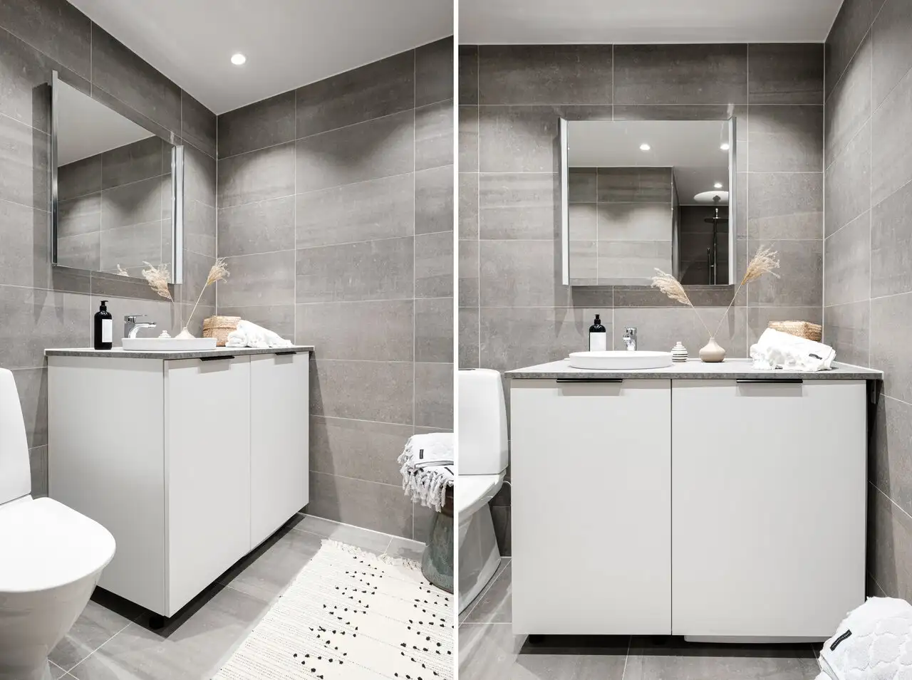 Badrummet är stilfullt renoverat med moderna materialval. På golvet ligger ljusgrå klinker med underliggande golvvärme och väggarna är klädda i ljusgrått kakel. Badrummet är utrustat med toalett, handfat med kommod, spegel med belysning, inbyggd tvättmaskin samt kombinerad tak- och handdusch. I taket sitter spotlights.