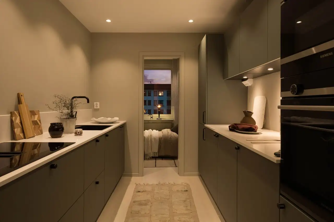 Ett kök i toppklass som har renoverats under 2022 med mycket omsorg och känsla. Den stilfulla skåpsinredningen från Kvik Bäckebol består av släta luckor i en grön ton. Arbetsbänkarna är beklädda med en ljus bänkskiva i komposit och ovanför sitter ett stänkskydd i samma material. Förvaringsmöjligheterna är förstklassiga i ett flertal köksskåp och arbetsytor på två sidor förenklar i matlagningen. Den kvalitativa utrustningen består av kombinerad och integrerad kyl/frys, inbyggd ugn och micro, induktionshäll med inbyggd fläkt samt en integrerad diskmaskin.