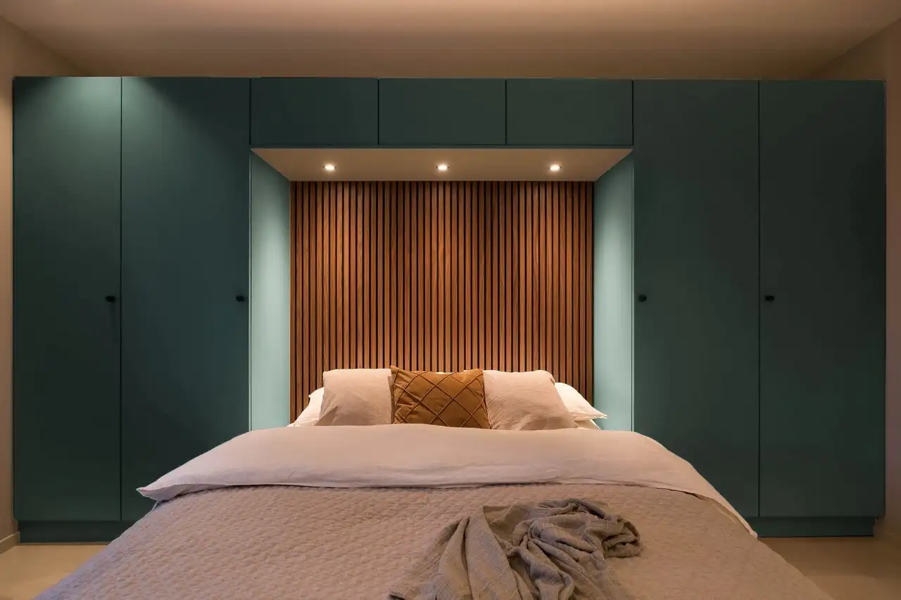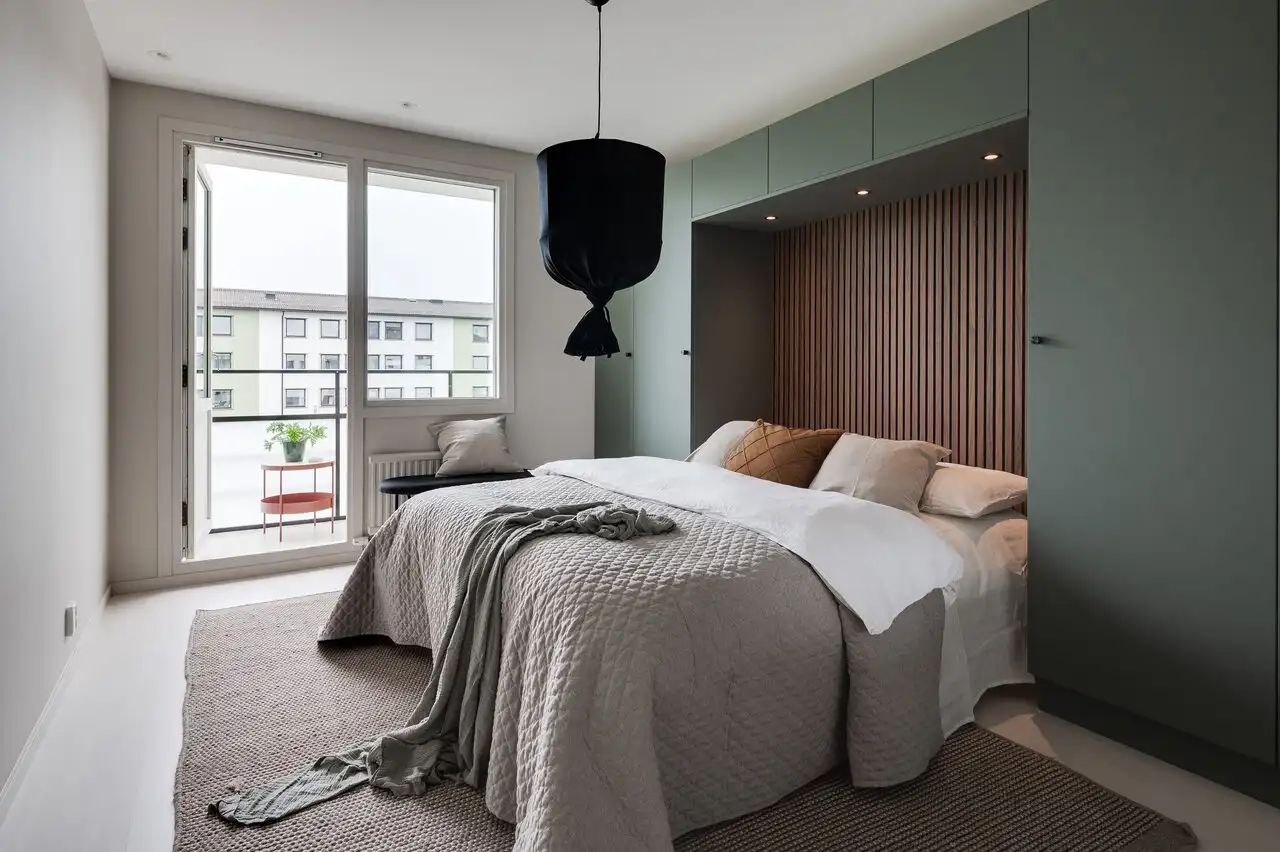 Hemmets huvudsovrum är rymligt och det stora fönsterpartiet förser rummet med ett härligt ljus. Fyra garderober plus överskåp står för förvaringen och här ryms med enkelhet en dubbelsäng emellan, samt annat möblemang. Garderobslösningen ingår ej, men kan köpas loss vid sidan av överlåtelsen. Härifrån når ni hemmets mysiga balkong.