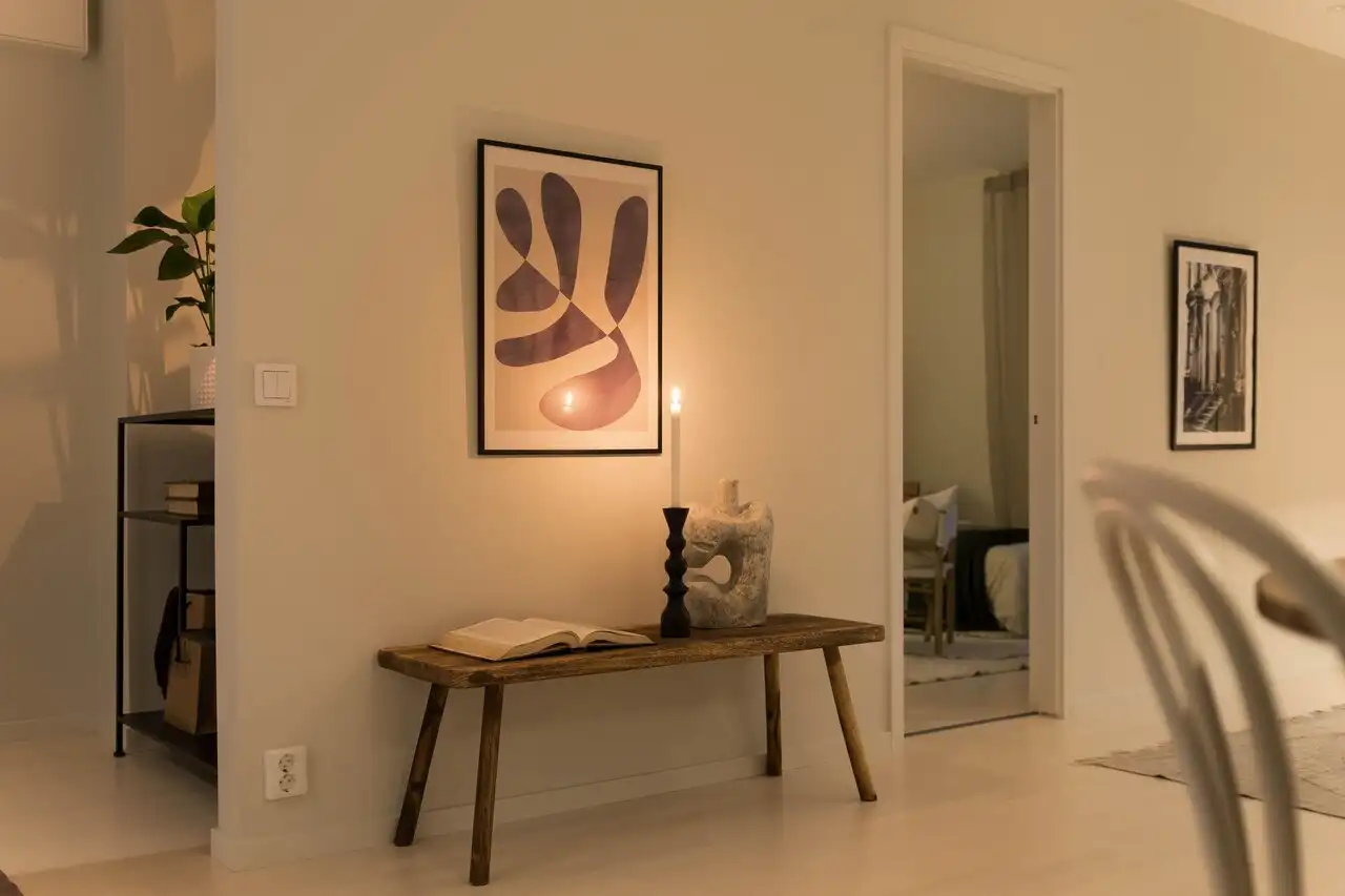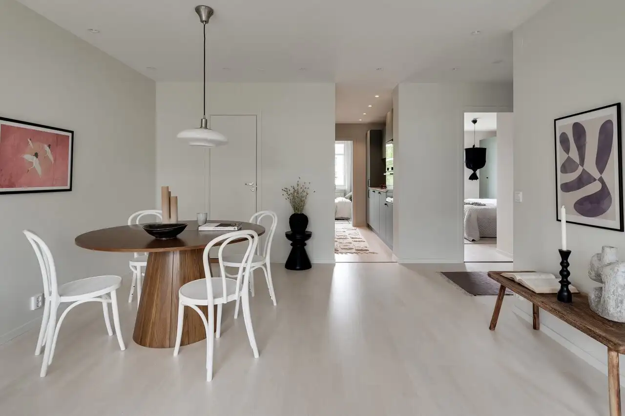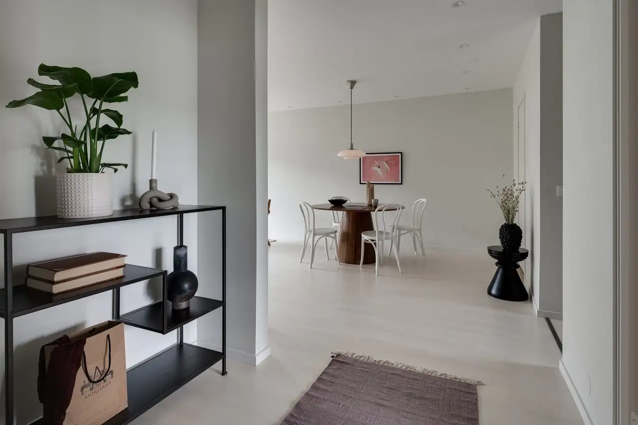 Njut av ett topprenoverat hem där allt är sprillans nytt och genomtänkt i minsta detalj. Hela lägenheten genomsyras av påkostade material och exklusiv inredning. På golvet ligger ett vitlaserat parkettgolv och ytskikten är målade i trendriktiga färger vilket är genomgående för hela lägenheten. Även alla element, dörrfoder, lister, fönsterkarmar m.m. är målade i samma färger som väggarna. I taket sitter infällda spotlights (förutom i ena sovrummet), och all belysning kan styras med en app i telefonen, Plejd.