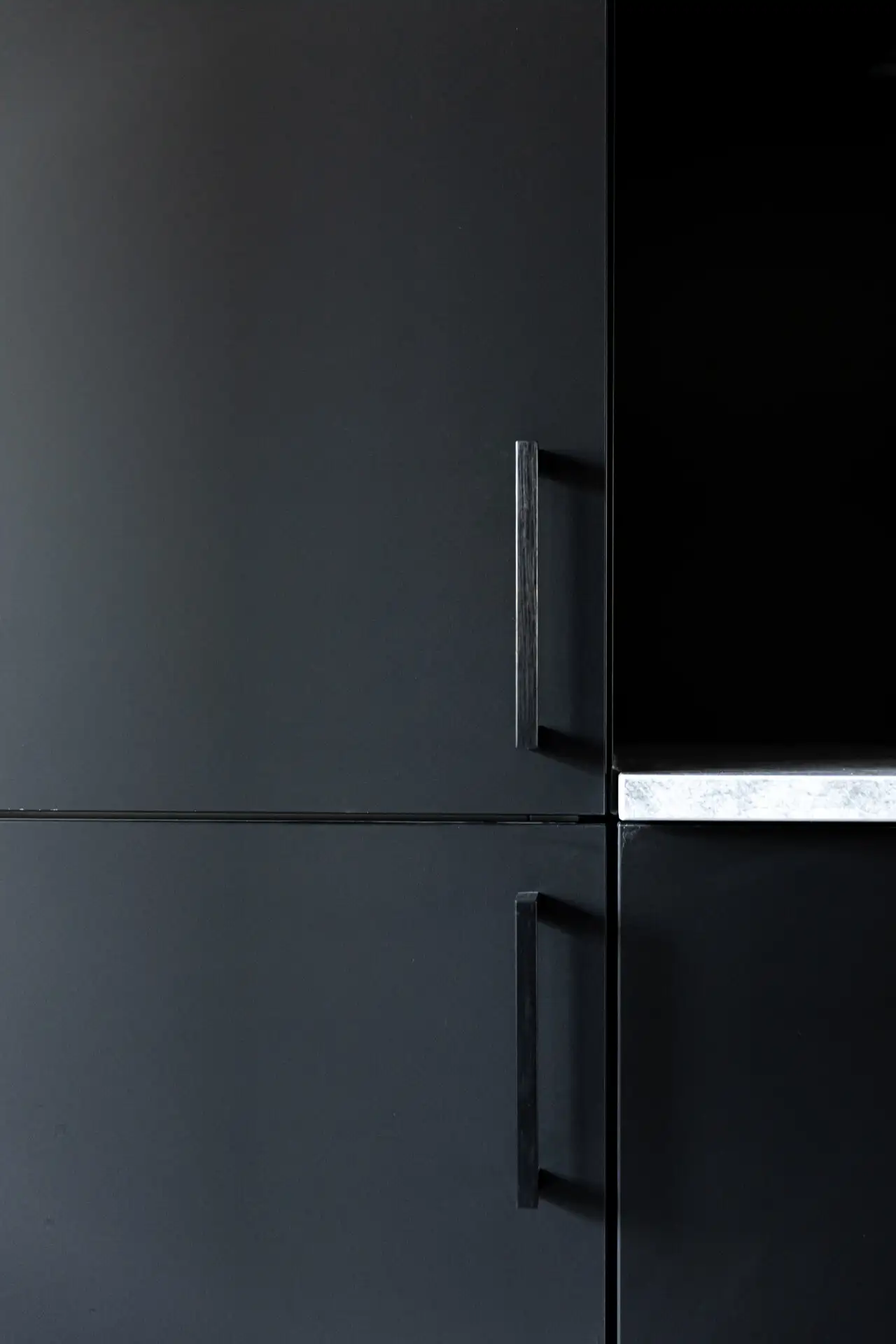 Hemmets stilfulla kök från KVIK Bäckebol är smakfullt inrett med svart köksinredning och integrerade vitvaror. Gråa bänkskivor och väggar målade i grått harmoniserar med köksinredningen. Även här ligger ett grått klinker på golvet. Köket har gott om både arbetsytor och förvaringsutrymmen och är utrustat med kombinerad kyl/frys, induktionshäll, fläktkåpa, ugn, micro samt diskmaskin.